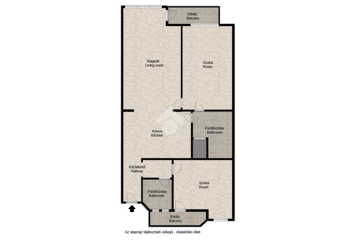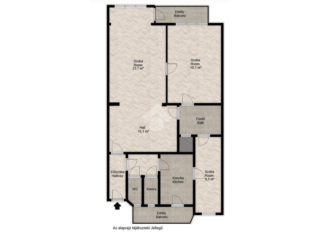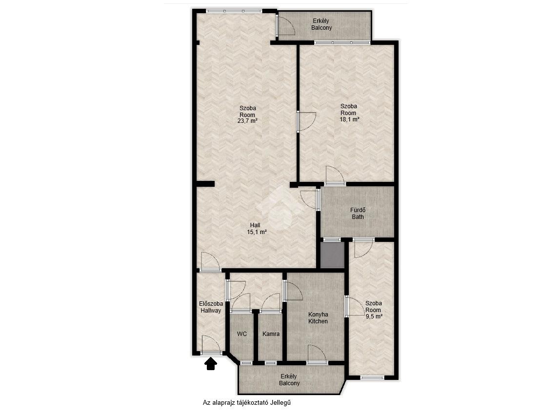 A lakás központi helysége egy 15 nm-es hall, szomszédságában találjuk a 23 nm -es, utcai nézetű, dél-keleti fekvésű, erkélykapcsolatos nappalit, a 18 nm-es hálószobát és a fürdőt.