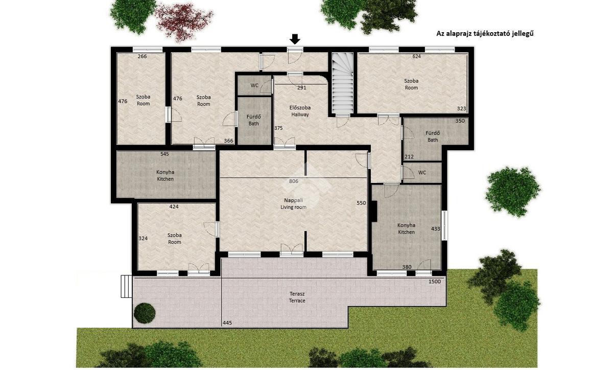 Helységei tágasak, központi része a nm-es teraszkapcsolatos, nagy üvegfelülettel rendelkező márványkandallós nappali.