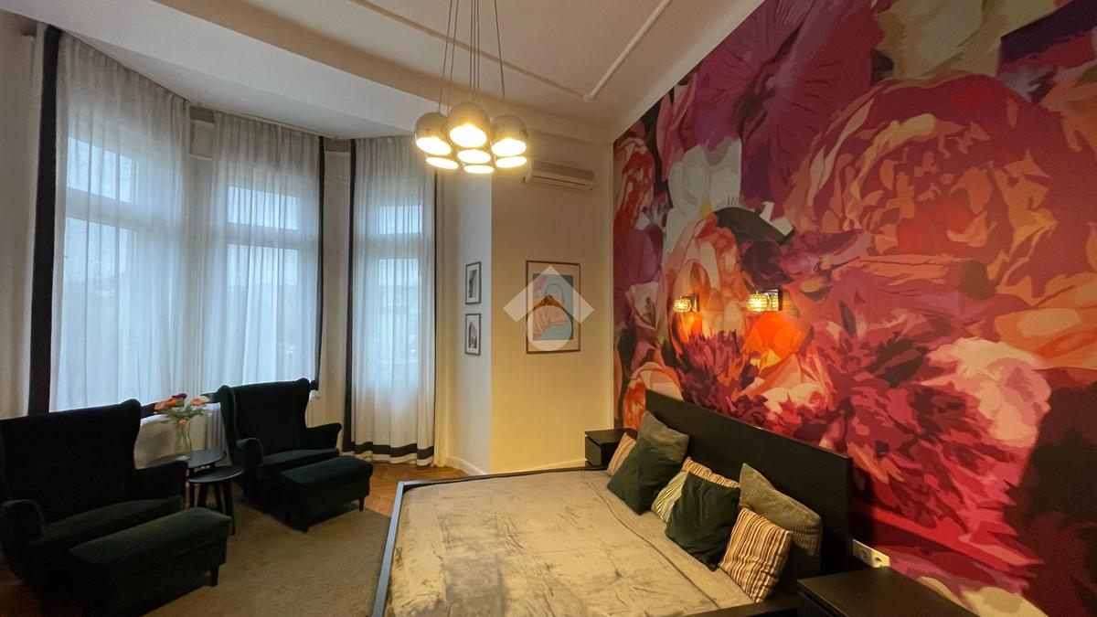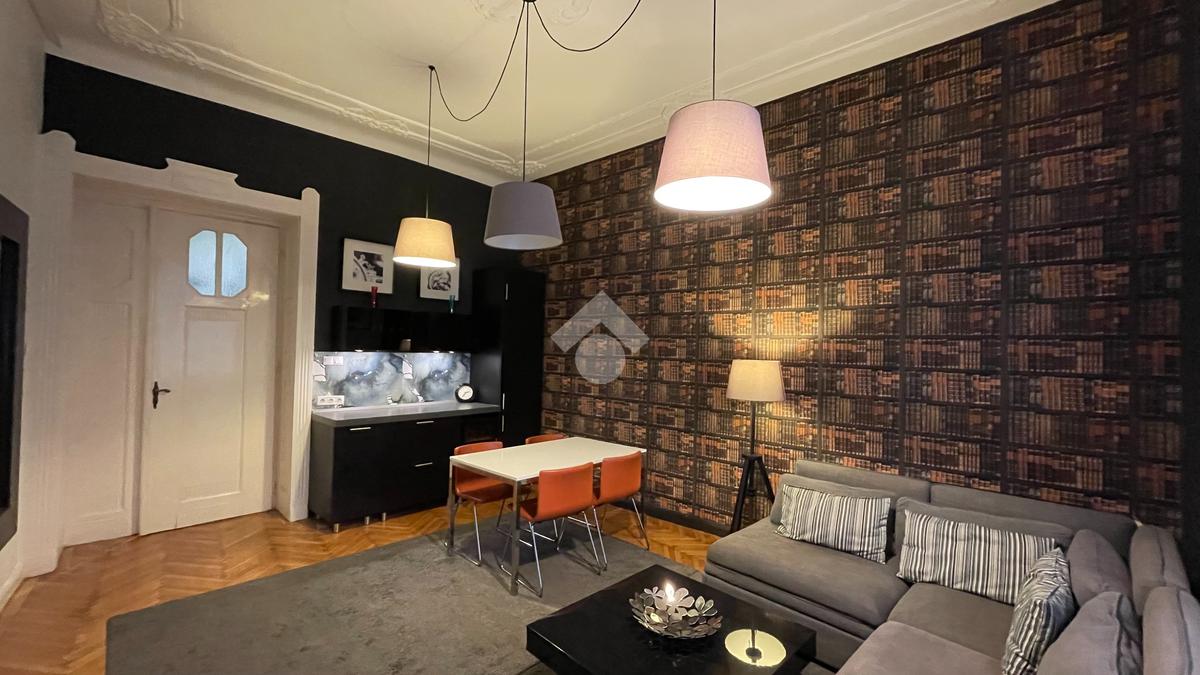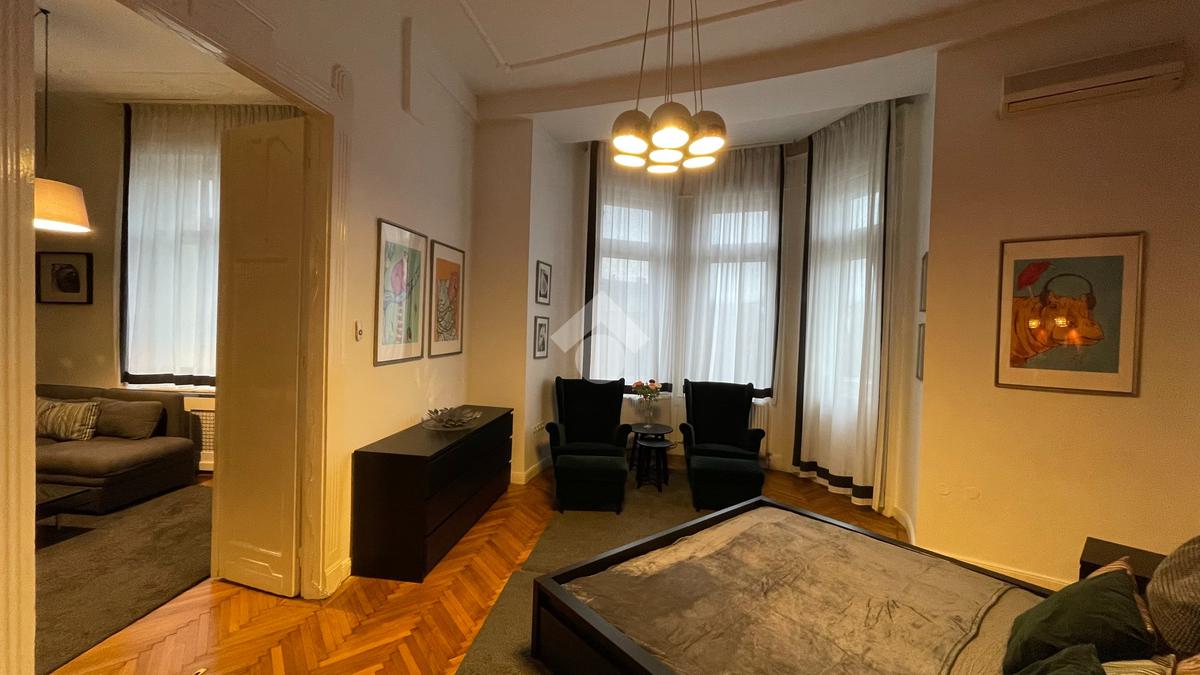 Az ingatlan központi része egy tágas, nyugati fekvésű, polgári jegyeket hangsúlyozó, praktikusan kialakított, nagy belmagasságú nappali.