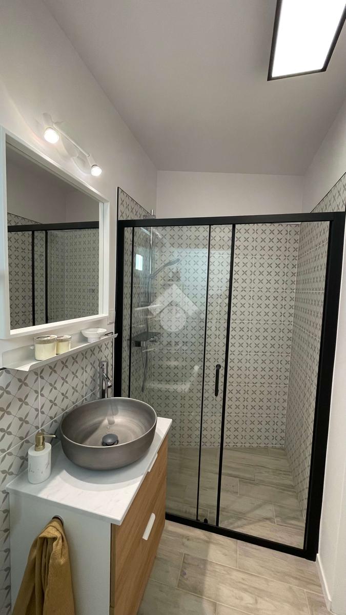 A fürdőszobában egy ideális méretű épített zuhany, mosdó és egy szeparált wc kapott helyet.