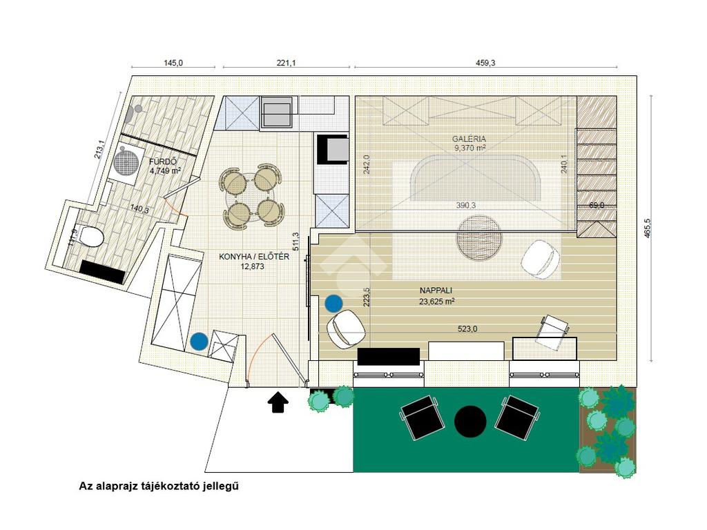 A terek tágasak, modern kialakításúak és praktikusan berendezettek. A 395 cm-es belmagasságot rendkívül jól használták ki. A nappaliban kialakított álló galéria 185 cm magasságot kapott, míg az alatta pihenésre kialakított lounge tér 2 m magas.